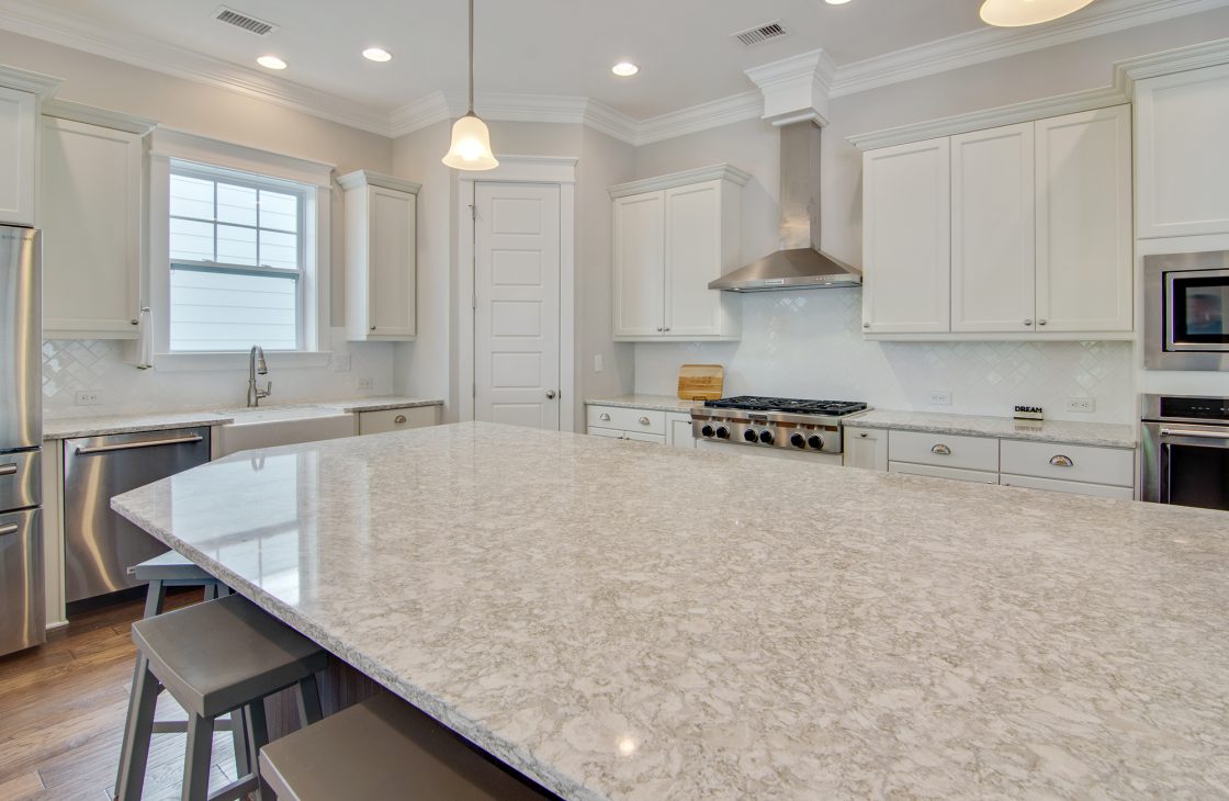 Entertaining is a breeze in the well-equipped gourmet kitchen with Samsung and KitchenAid appliances large kitchen island, gas stove, brushed nickel hardware, and beautiful quartz countertops.