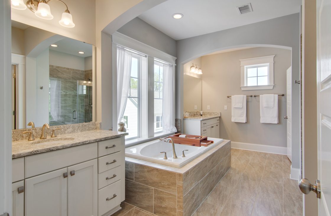 The divine master suite includes a stylish bath suite with a spa-worthy tub, separate glass shower, efficient (and almost silent) bathroom fans, and huge custom closet by A Closet Case.