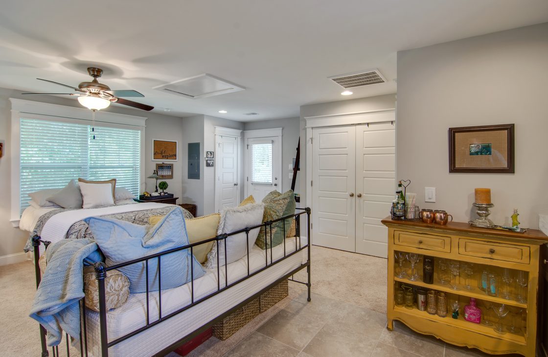 The upstairs loft, with private porch access, makes for an excellent playroom, media room, study, or music studio.