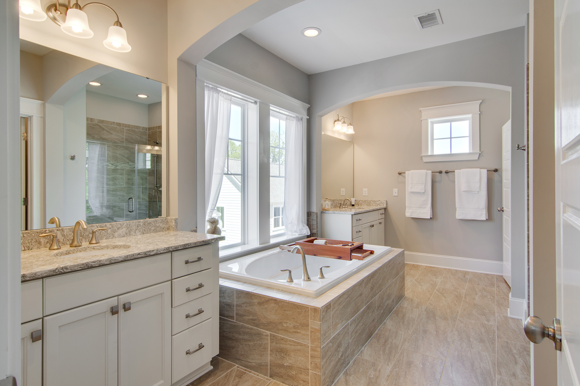 The divine master suite includes a stylish bath suite with a spa-worthy tub, separate glass shower, efficient (and almost silent) bathroom fans, and huge custom closet by A Closet Case.