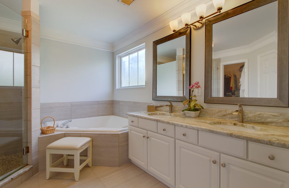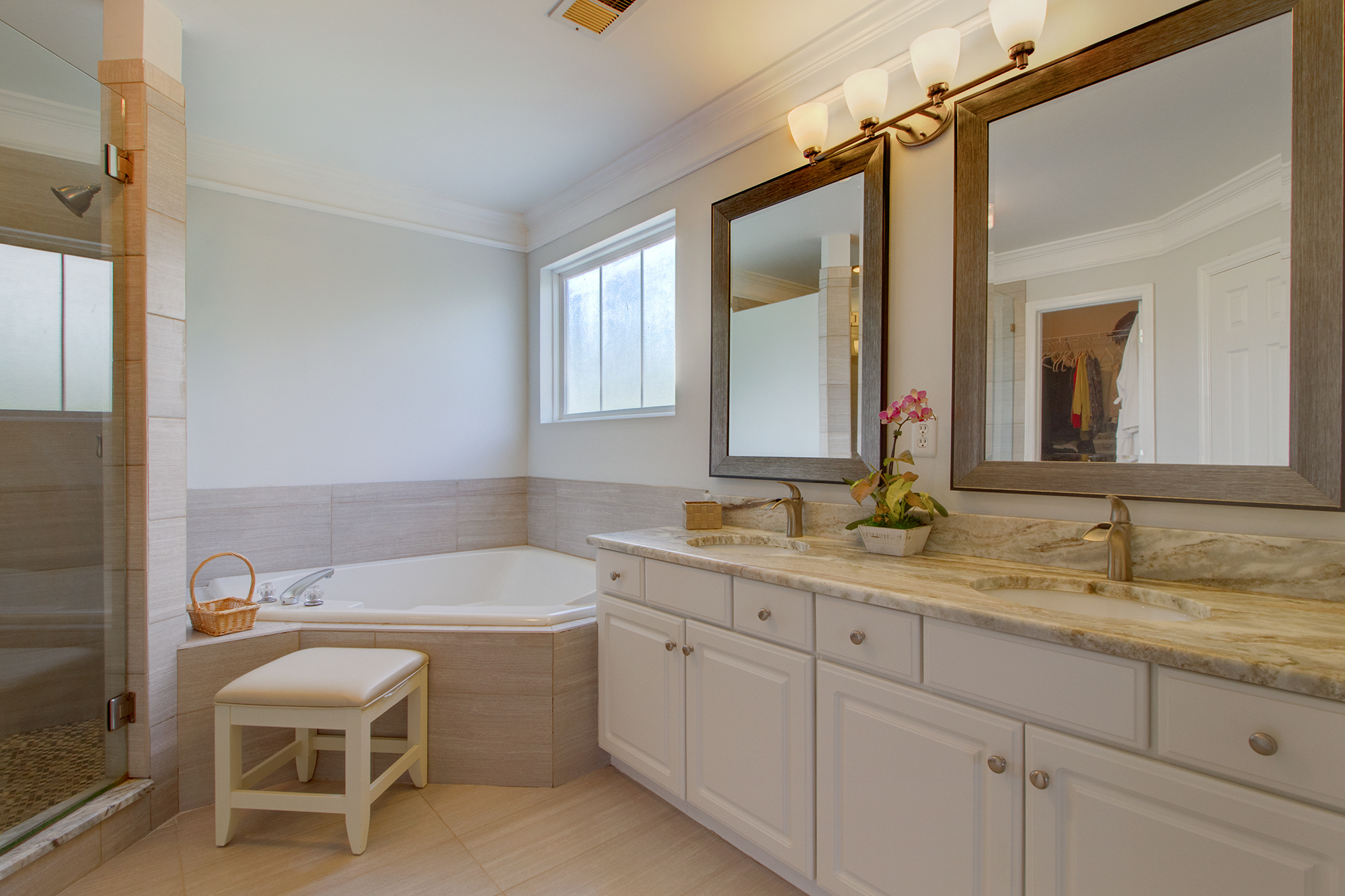 The bath has been totally updated with a separate soaking tub, glass shower with ceramic tile, dual vanities with honed granite countertops, and two closets. The spacious glass shower can easily accommodate a sitting bench to create your own spa-like experience.