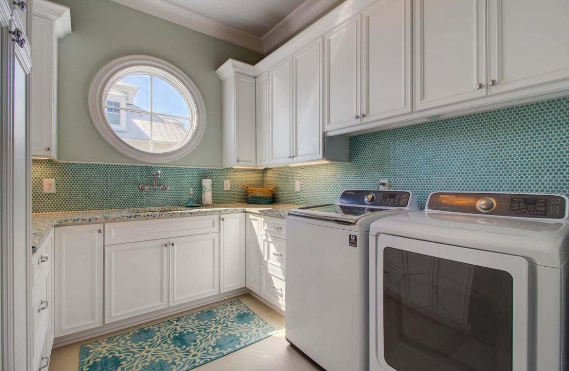 Let’s not forget the amazing laundry room with Vetrazzo countertops, penny round backsplash, and an abundance of cabinetry for storage.