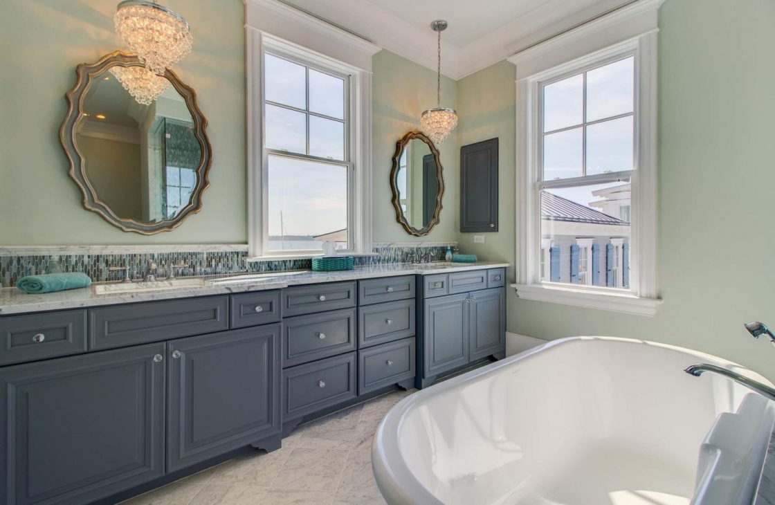 The breakfast area is sure to be one of your favorite spots beaming with natural light and looking out at the river. A large pantry and office area are located behind the kitchen as well. A powder room with a custom round window completes the first floor.