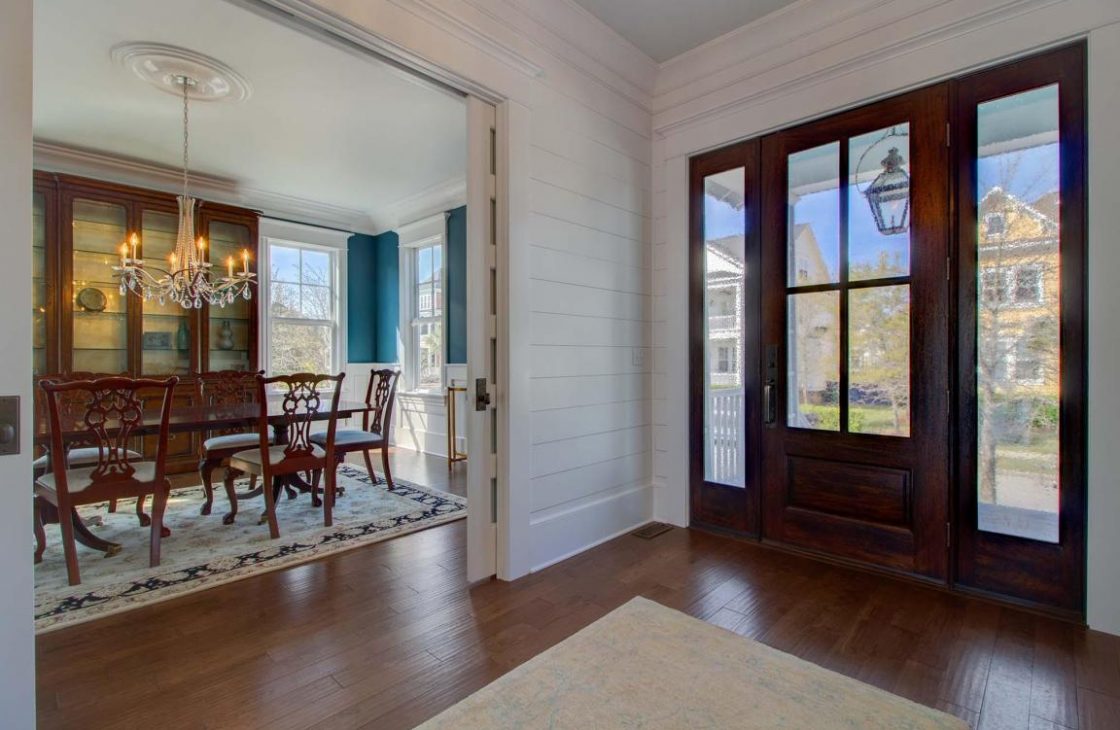 The well appointed office and formal dining room, with wainscot trim, off of the foyer are both flanked by glass pocket doors.