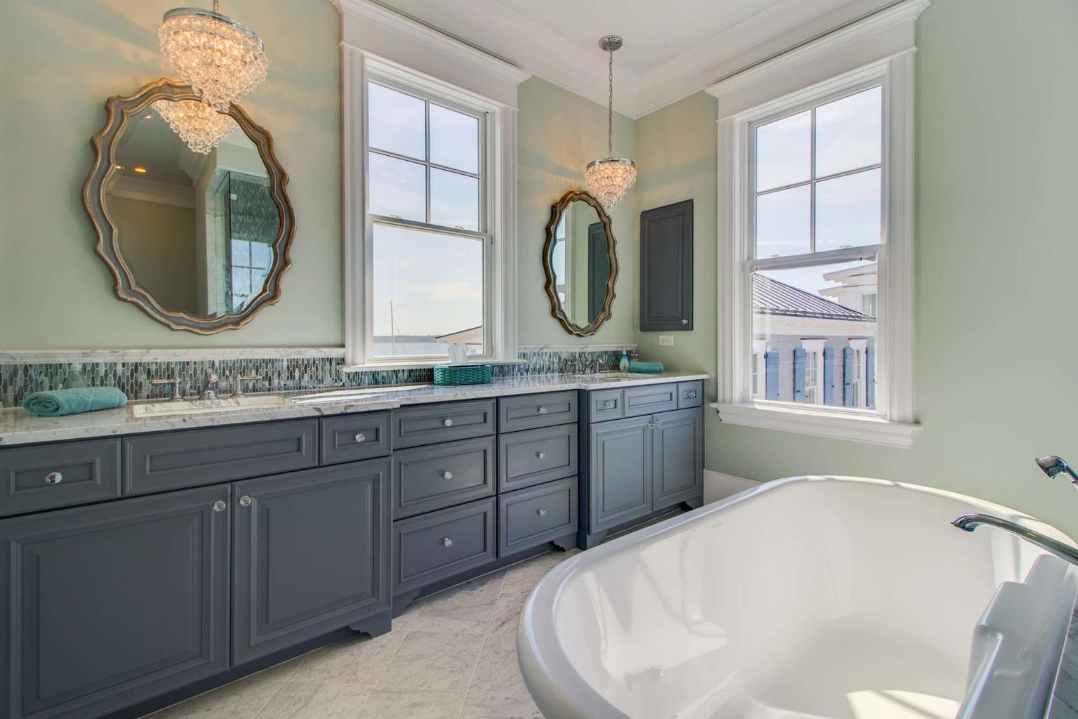 The breakfast area is sure to be one of your favorite spots beaming with natural light and looking out at the river. A large pantry and office area are located behind the kitchen as well. A powder room with a custom round window completes the first floor.