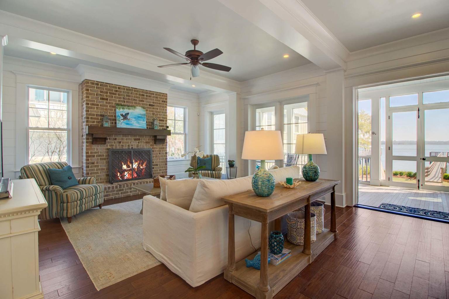 The family room has a floor to ceiling brick fireplace adorned by a hickory mantle. The large, high impact windows, allow for panoramic views of the Wando River.