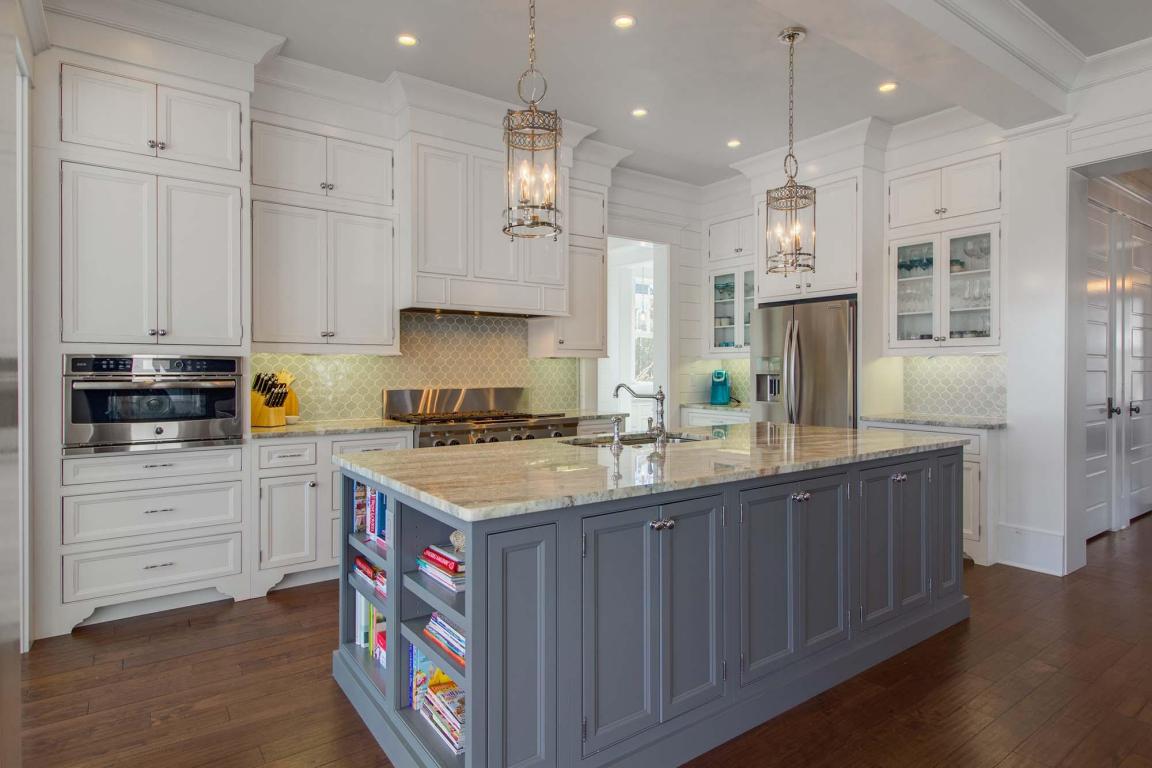 The kitchen is a true chef’s dream, equipped with an oversize island, granite countertops, Walker Zanger backsplash, and state of the art appliances.